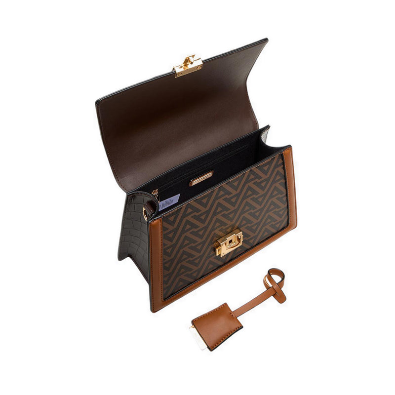 Cool and compact, this on-the-go shoulder bag has sleek buckle accents and a clean zip-top shape that's equal parts cute and functional.