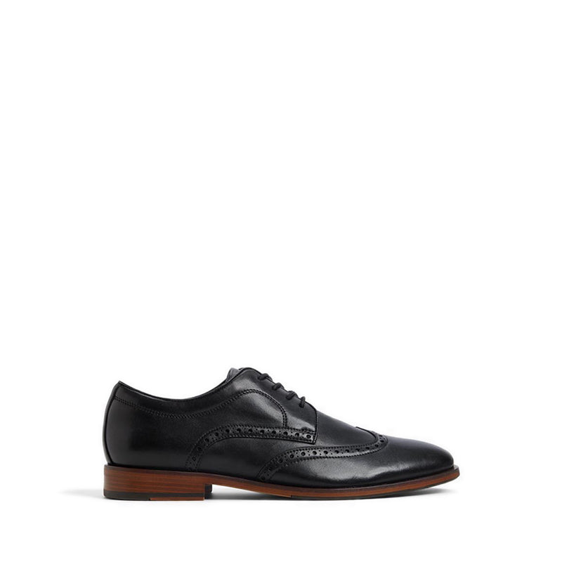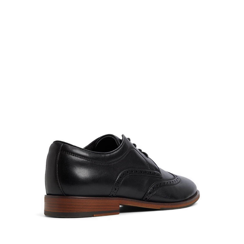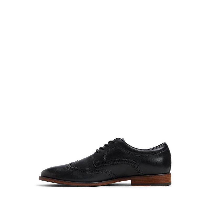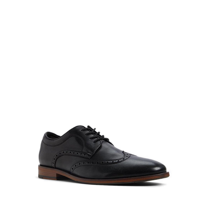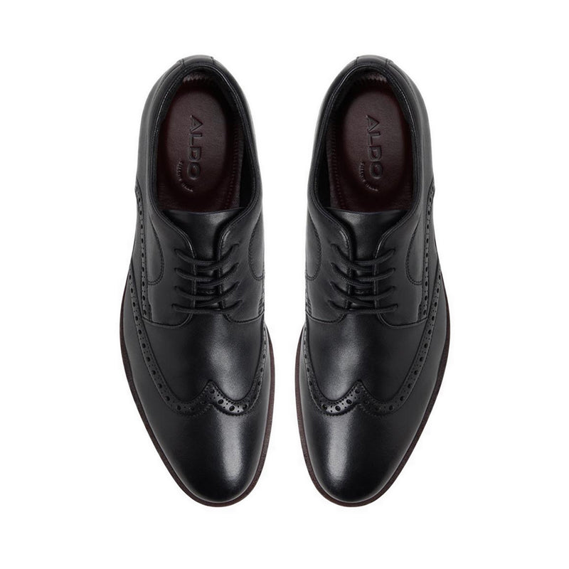 Men's dress shoes, specifically oxfords or lace-ups, known for their comfort features like dual-density foam and padded insoles, designed for all-day wear and a comfortable walking experience.