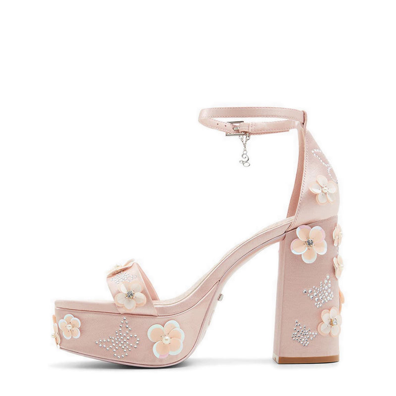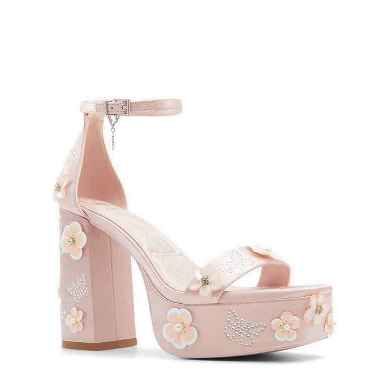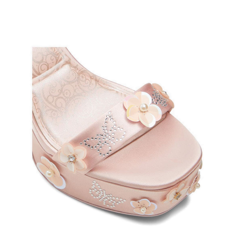 A party pair that are perfectly pink. These Glinda-inspired pink platform sandals are adorned with glittering flowers and magical butterfly appliques atop a romantic satin finish. Dare to add a glamourous touch to any night-out look.